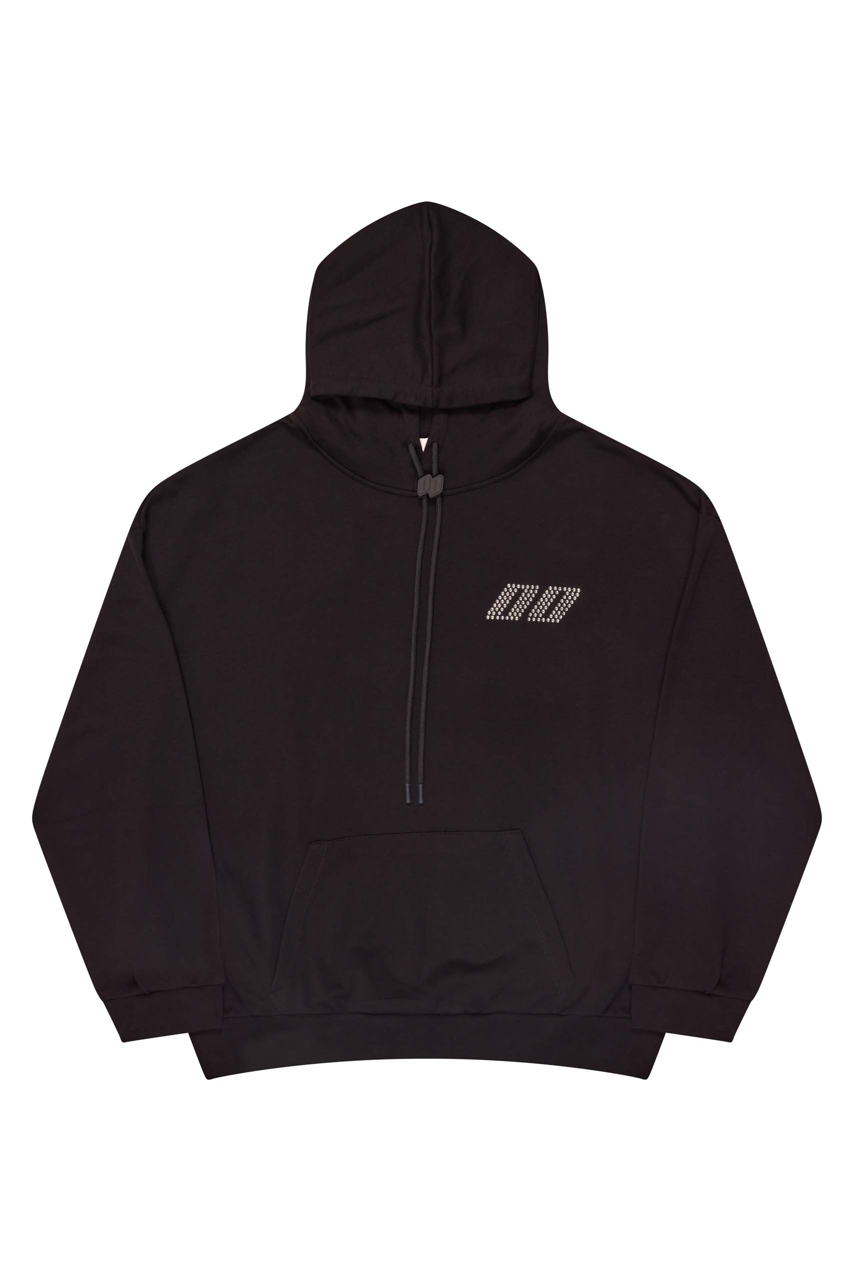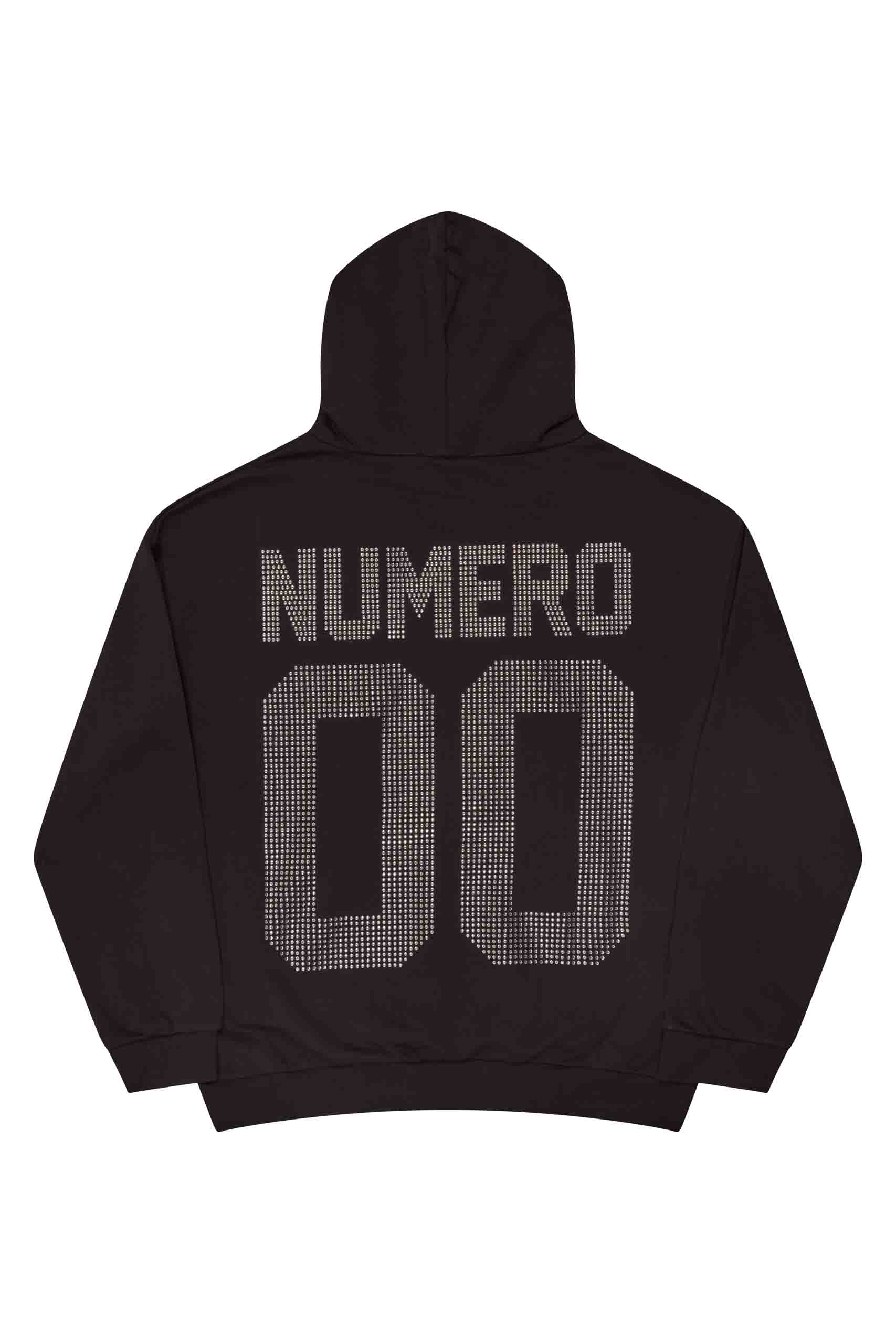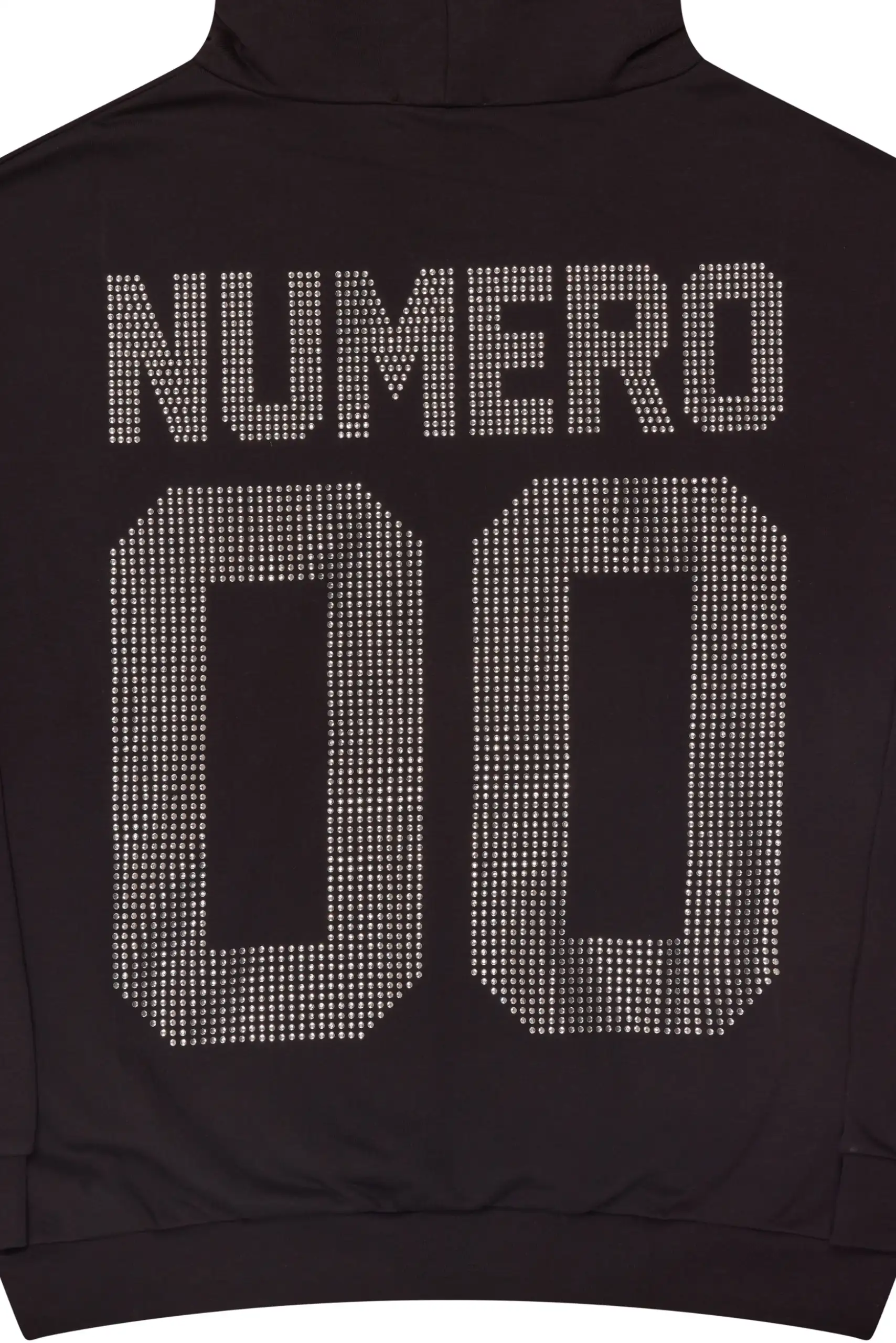 Felpa oversize con manica scesa, realizzata in tessuto felpa diagonale. Lavorazione in strass sul logo sulla schiena e scritta “00” sul lato cuore.