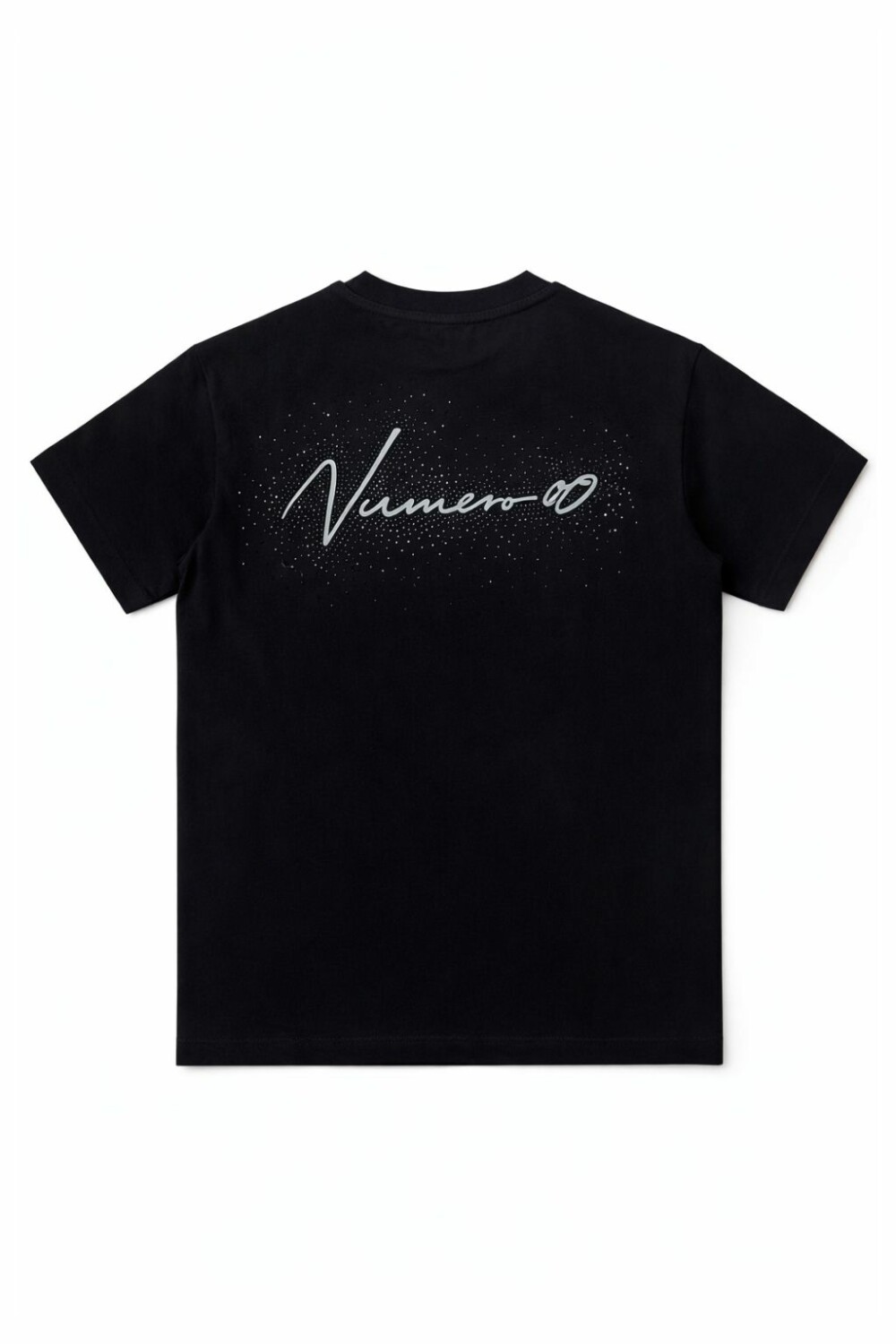 T-shirt nera oversize con logo minimalista sul davanti e una grafica di grande impatto sul retro, che combina serigrafia e dettagli in strass.