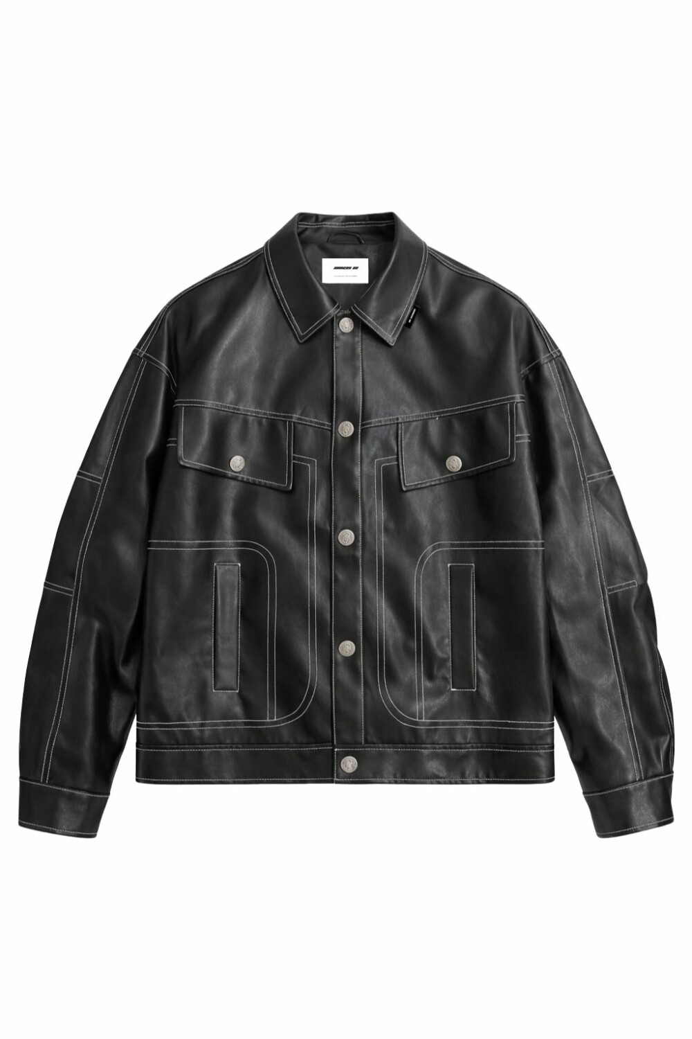 Giacca in eco-pelle con una silhouette pulita e strutturata, caratterizzata da un audace logo “00” in rilievo sul retro