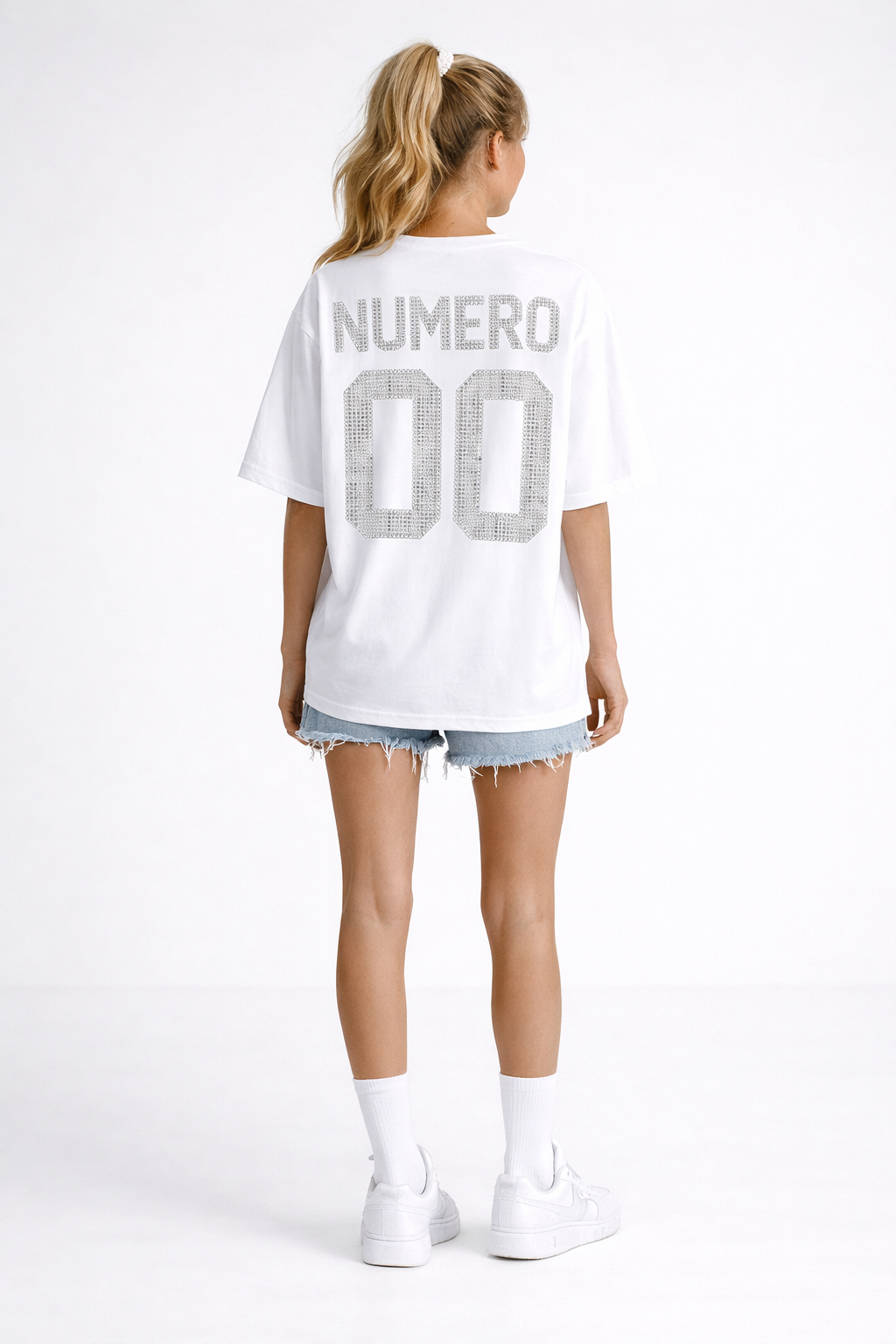 White oversized T-shirt featuring a bold “NUMERO 00” graphic on the back, fully embellished with Swarovski crystals for a high-impact shine.