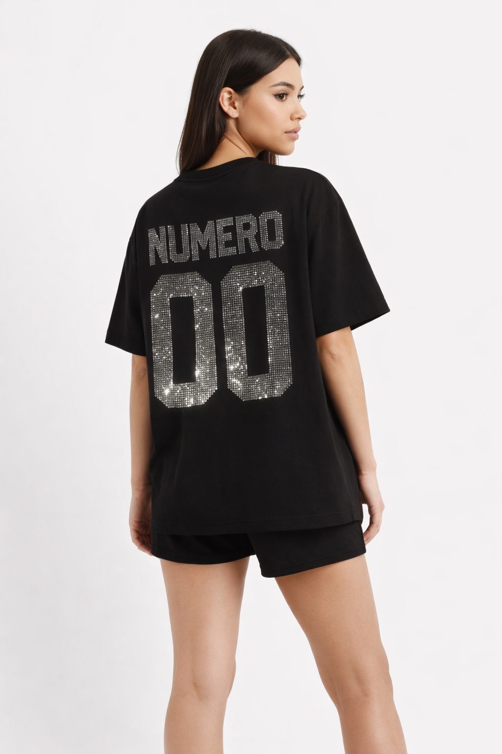 Black oversized T-shirt featuring a bold “NUMERO 00” graphic on the back, fully embellished with Swarovski crystals for a high-impact shine.
