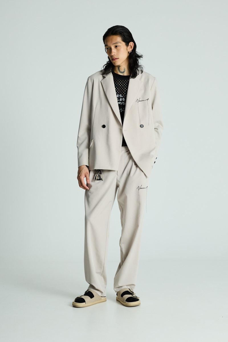 Elegant beige tailored trousers featuring a clean silhouette and subtle embroidered detail for a refined finish.