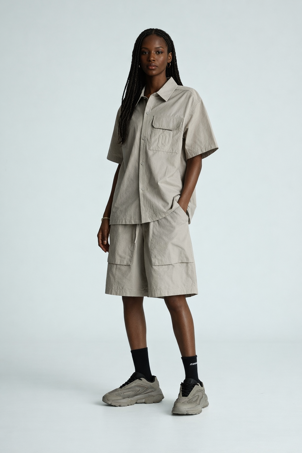 Features a tonal embossed logo on the chest pocket.