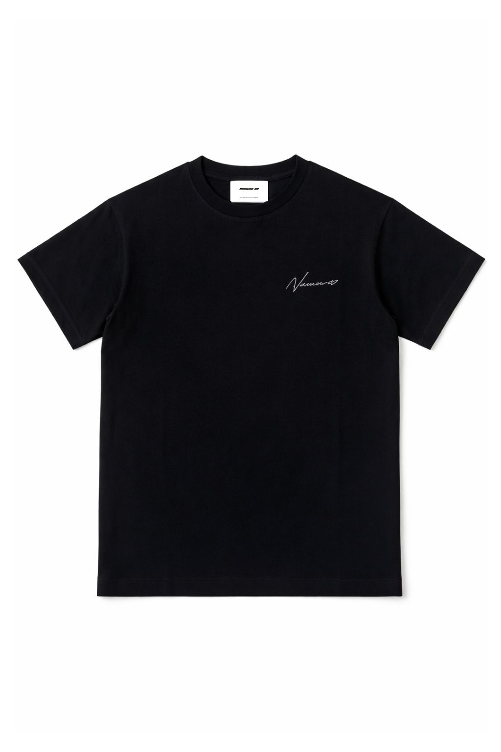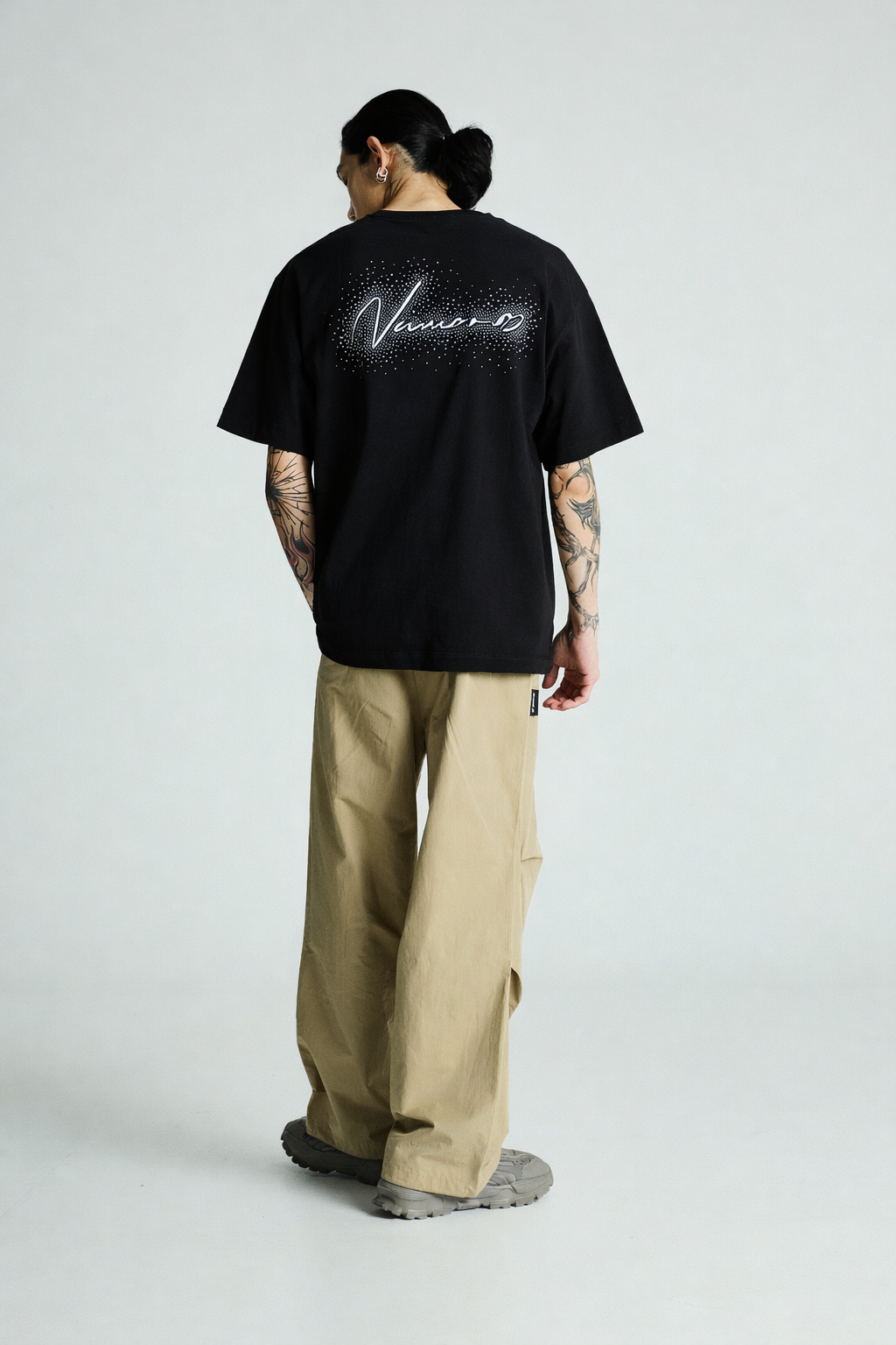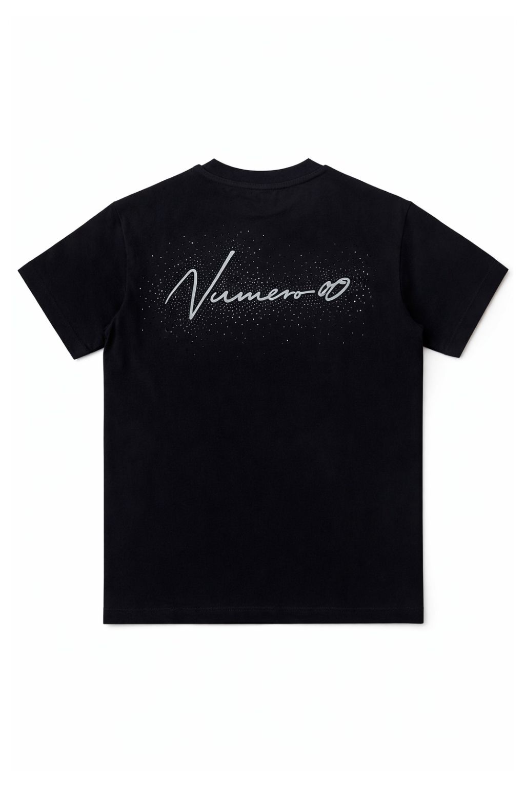 Black oversized T-shirt featuring a minimal logo on the front and a statement back graphic combining screen print with rhinestone detailing.
