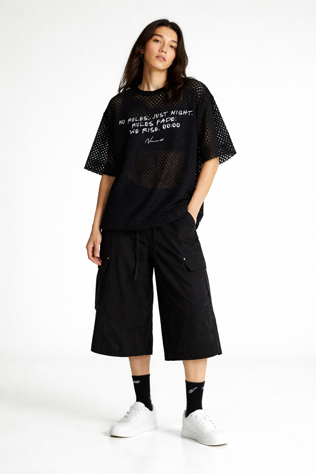 Features a breathable open-knit texture and front graphic print for a bold, night-inspired look.