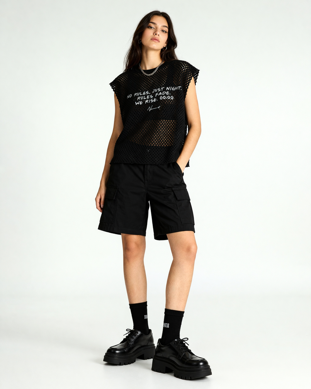 Features a breathable open-knit texture and front graphic print for a bold, night-inspired look.